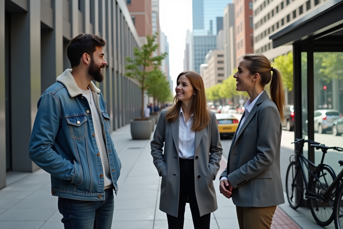 Groupe d'adultes divers discutant près d'un arrêt de bus en ville